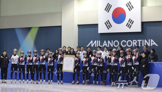 (진천=뉴스1) 김용빈 기자 = 정청래 더불어민주당 대표가 23일 충북 진천국가대표선수촌 빙상장에서 쇼트트랙 선수들과 기념촬영 하고 있다. 2026.1.23/뉴스1