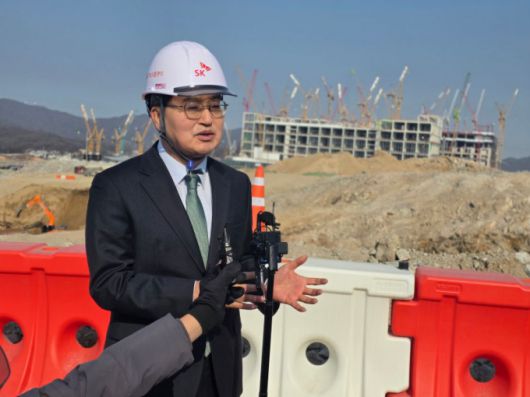 김동연 경기도지사가 23일 용인시 원삼면 반도체 일반클러스터 SK하이닉스 공사 현장에서 기자 질문에 답하고 있다./사진=이민호기자 |