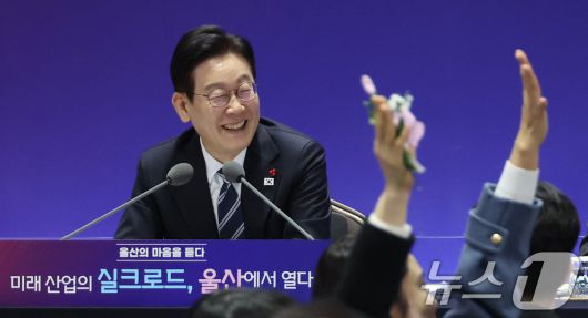 (울산=뉴스1) 허경 기자 = 이재명 대통령이 23일 울산전시컨벤션센터에서 열린 '울산의 마음을 듣다‘ 타운홀 미팅에서 환하게 웃고 있다. 2026.1.23/뉴스1seiyu@news1.krCopyright ⓒ 뉴스1. All rights reserved. 무단 전재 및 재배포, AI학습 이용 금지.