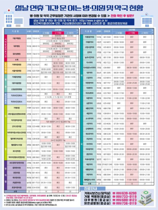 설 연휴 진료 병·의원·약국 정보는 거제시 누리집, 보건소 홈페이지, 시 SNS와 보건복지콜센터(129), 구급상황관리센터(119), 응급의료포털, 응급의료정보 앱에서 확인할 수 있다.