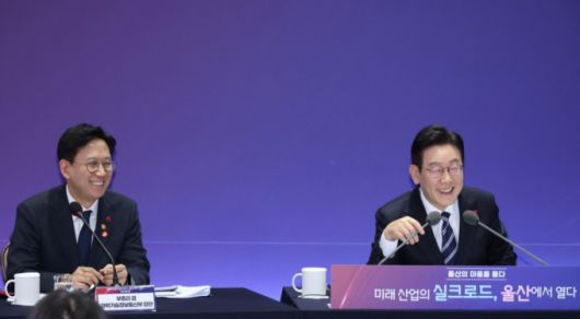 이재명 대통령이 22일 울산전시컨벤션센터에서 열린 '울산의 마음을 듣다' 타운홀미팅 간담회에서 배경훈 과학기술정보통신부 장관과 울산에서 처음 만났던 인연을 이야기하며 웃고 있다./사진=뉴스1 |