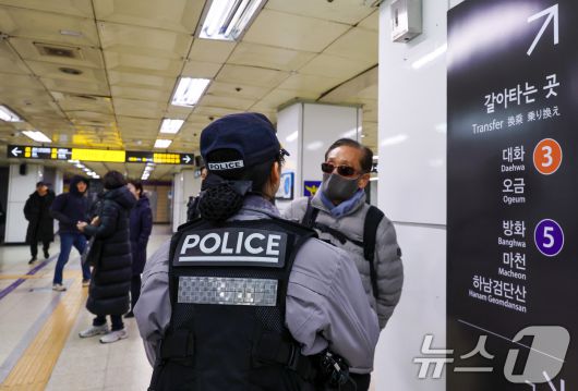 (서울=뉴스1) 최지환 기자 = 23일 오후 서울지히철 1호선 종로3가역에서 발생한 화재로 경찰이 승객의 승강장 진입을 통제하고 있다. 화재 영향으로 1호선 상행방면이 종로3가역을 무정차 통과중이다. 2026.1.23/뉴스1ssaji@news1.krCopyright ⓒ 뉴스1. All rights reserved. 무단 전재 및 재배포, AI학습 이용 금지.