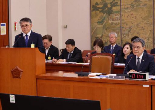 이재필(왼쪽) 궁능유적본부장이 ‘2025년도 국가유산청 등에 대한 문화체육관광위원회 국정감사’에서 김건희 여사의 종묘 차담회 의혹과 관련한 질의에 답하고 있다(사진=연합뉴스). |