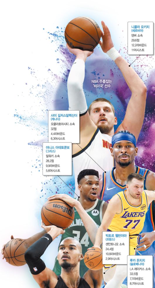 2월 16일(한국 시간) 캘리포니아 잉글우드에서 열릴 경기를 앞두고 최근 선발 라인업이 발표됐는데 10명 가운데 5명이 ‘비미국인’이다. 세르비아 출신 니콜라 요키치(덴버)가 서부콘퍼런스 선수단 투표 1위와 팬·미디어 투표 2위에 올랐고 슬로베니아의 루카 돈치치(LA 레이커스)는 팬 투표 1위, 미디어 투표 2위를 차지했다. 그리스의 야니스 아데토쿤보(밀워키)는 동부 팬 투표 1위, 선수단 투표 2위다. 팬(50%)과 선수단(25%), 미디어(25%) 투표를 합산해 10명이 뽑혔다. 서부에서는 요키치와 돈치치, 캐나다의 샤이 길저스알렉산더(오클라호마시티), 프랑스의 빅토르 웸반야마(샌안토니오)까지 무려 4명이 외국 선수다. 미국 선수는 스테픈 커리(골든스테이트) 한 명뿐이다.
