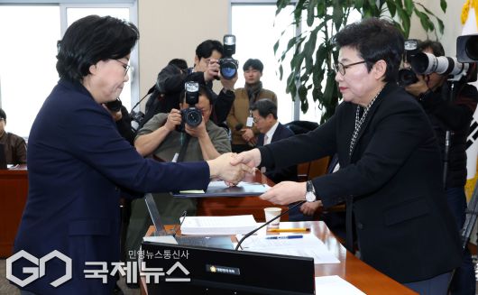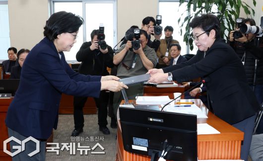 (서울=국제뉴스) 이혜훈 기획예산처 장관 후보자가 23일 오전 서울 여의도 국회 재정경제기획위원회 전체회의에서 열린 인사청문회에서 임이자 위원장에게 선서문을 전달하고 있다./사진=이용우 기자