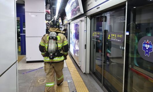 23일 서울 지하철 1호선 종로3가역 상행선 열차의 차량 하부에서 연기가 발생해 승객들이 전원 하차, 대피했다. 소방당국에 따르면 연기는 브레이크 과열로 인한 것으로 추정된다. 연기 발생 뒤 승강장 상황 살피는 소방대원의 모습. 연합뉴스 |