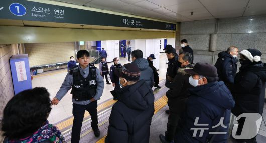 (서울=뉴스1) 최지환 기자 = 23일 오후 서울지히철 1호선 종로3가역에서 발생한 화재로 경찰이 승객의 승강장 진입을 통제하고 있다. 화재 영향으로 1호선 상행방면이 종로3가역을 무정차 통과중이다. 2026.1.23/뉴스1ssaji@news1.krCopyright ⓒ 뉴스1. All rights reserved. 무단 전재 및 재배포, AI학습 이용 금지.