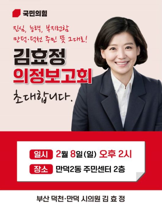 [부산=뉴스핌] 남동현 기자 = 부산시의회 김효정 의원(국민의힘, 북구 덕천·만덕)은 다음달 8일 오후 2시 만덕2동 주민센터 2층에서 제9대 의정활동 성과를 주민들에게 보고하는 의정보고회를 개최한다고 23일 밝혔다.