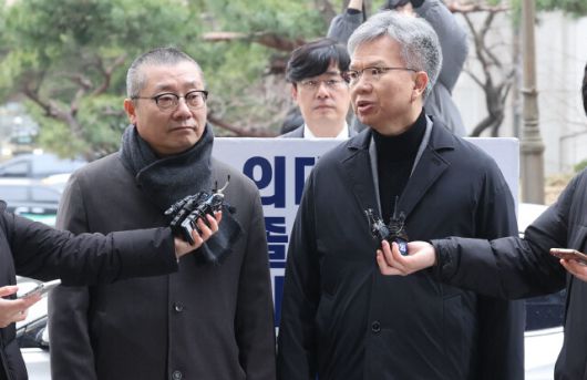 김택우 대한의사협회 비상대책위원장(오른쪽)과 박명하 조직강화위원장이 지난 2024년 3월12일 오전 서울 마포구 서울경찰청 공공범죄수사대에 출석하기 전 입장을 밝히고 있다. 백소아 기자 thanks@hani.co.kr |