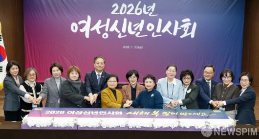 [서울=뉴스핌] 류기찬 기자 = 원민경 성평등가족부 장관(왼쪽에서 일곱번째)과 참석자들이 23일 오후 서울 중구 은행회관에서 열린 2026년 여성신년인사회에서 떡케이크를 자르고 있다. 2026.01.23 ryuchan0925@newspim.com