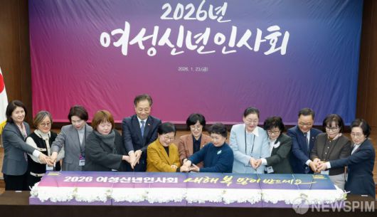 [서울=뉴스핌] 류기찬 기자 = 원민경 성평등가족부 장관(왼쪽에서 일곱번째)과 참석자들이 23일 오후 서울 중구 은행회관에서 열린 2026년 여성신년인사회에서 떡케이크를 자르고 있다. 2026.01.23 ryuchan0925@newspim.com