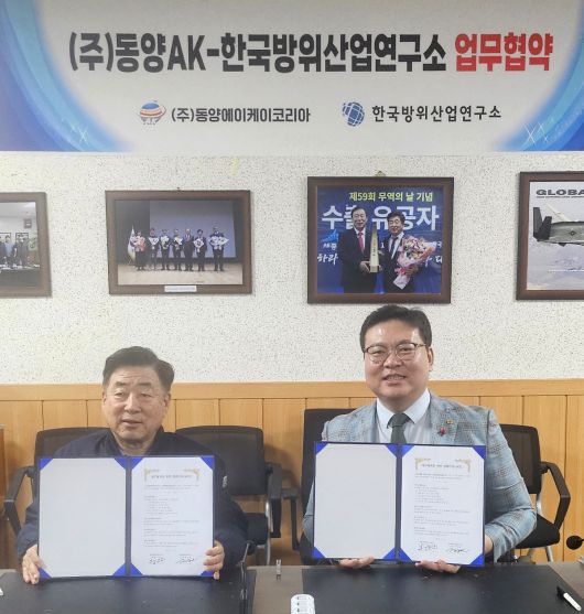 김윤중 동양AK 회장(왼쪽)과 최기일 한국방위산업연구소 연구소장이 MOU 체결 후 기념사진을 촬영하고 있다. |