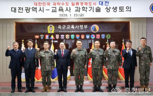 ▲ 대전시와 육군교육사령부 간 과학기술 협력과 상생 방안을 논의한 뒤, 이장우 대전시장(왼족에서 네 번째)과 육군교육사령부 관계자들이 함께 자리해 협력 의지를 확인하고 있다 |