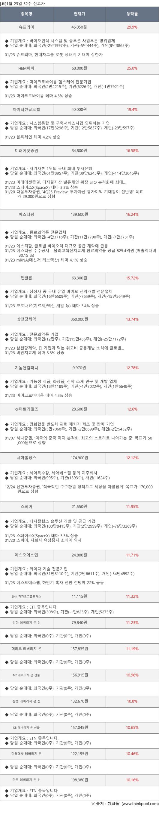 [서울=뉴스핌] 로보뉴스 = 1월 23일, 인공지능 투자비서 ‘AI라씨로’가 52주 신고가가 발생한 슈프리마(236200), HEM파마(376270) 등에 대해 최근 동향을 분석했다.