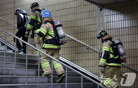 (서울=뉴스1) 최지환 기자 = 23일 오후 서울지하철 1호선 종로3가역에서 소방관이 철수하고 있다. 이날 오후 2시 41분경 1호선 상행선 열차 하부에서 연기가 발생해 한때 승객들이 외부로 대피하고 상행선 열차가 무정차 통과했다. 현재 1호선 열차는 정상운행중이다. 2026.1.23/뉴스1