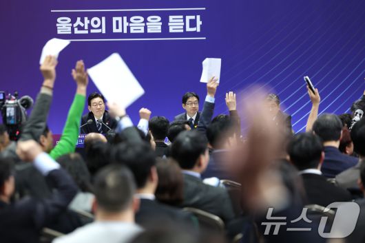 (울산=뉴스1) 허경 기자 = 이재명 대통령이 23일 울산전시컨벤션센터에서 열린 '울산의 마음을 듣다‘ 타운홀 미팅에서 참석자들을 질문을 받고 있다. 2026.1.23/뉴스1seiyu@news1.krCopyright ⓒ 뉴스1. All rights reserved. 무단 전재 및 재배포, AI학습 이용 금지.