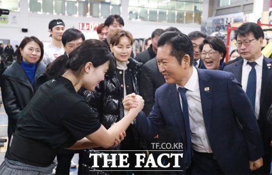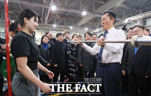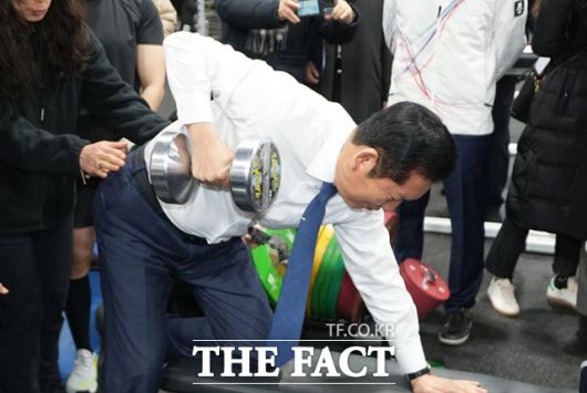 [더팩트 | 송호영 기자] 정청래 더불어민주당 대표가 23일 충북 진천국가대표선수촌 웨이트트레이닝장을 방문해 선수들을 격려하고 바벨을 들어올리고 있다.