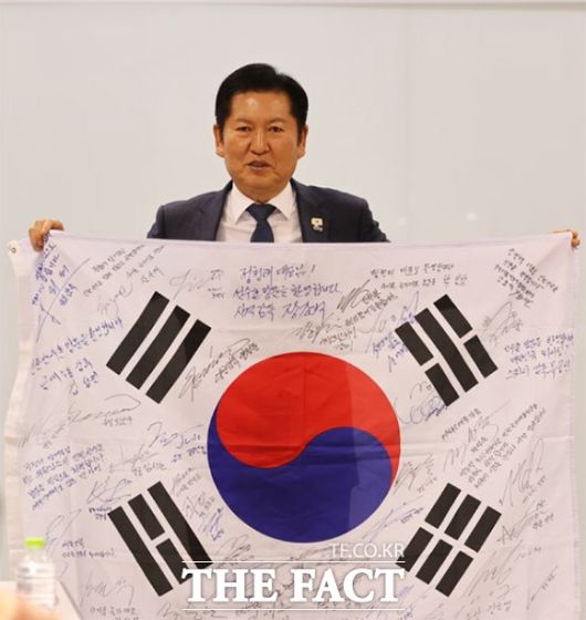 정 대표는 이날 오후 국가대표 지도자들과 간담회를 가졌고, 선수들의 싸인이 그려진 태극기를 선물 받았다.