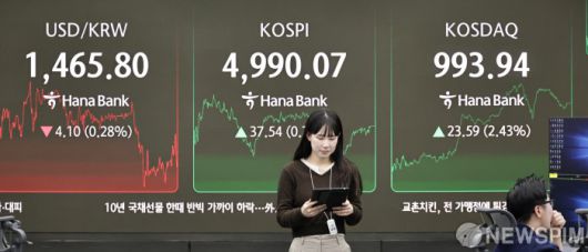 [서울=뉴스핌] 양윤모 기자 = 23일 오후 코스피가 전장 종가보다 37.54 포인트(0.76%) 상승하며 4990.07로, 코스닥은 23.59 포인트(2.43%) 상승한 993.94로 장을 마감한 가운데, 서울 중구 하나은행본점 딜링룸에서 직원들이 업무를 보고 있다. 서울외환시장에서 달러/원 환율은 전장 대비 4.10원 하락한 1465.80원에 주간거래를 마감했다. 2026.01.23 yym58@newspim.com