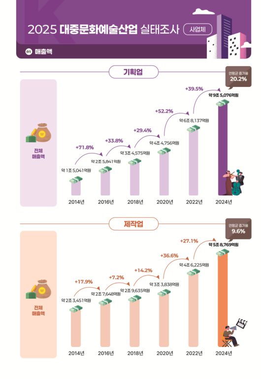 대중문화예술기획업의 국내 매출은 7조8020억 원, 해외 매출은 1조7057억 원을 기록해 직전 조사 대비 각각 35.5%, 61.7% 성장했다.