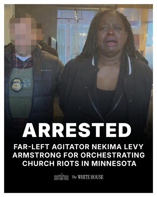 사진 속 여성은 지난 18일 미네소타주 세인트폴에서 교회 예배를 방해한 혐의로 체포된 3명 중 한 명인 네키마 레비 암스트롱이다. 당시 암스트롱 등 시위대는 해당 교회 목사가 ICE와 관련 있다며 교회 앞에서 항의 시위를 벌였다.
