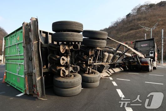 (대구=뉴스1) 공정식 기자 = 23일 오후 2시 6분쯤 대구 수성구 범안삼거리에서 25톤 트레일러가 전도되면서 태양광 패널 등이 실린 20여 톤짜리 컨테이너가 적재함에서 떨어지는 사고가 발생해 경찰이 사고 현장을 수습하고 있다. 경찰은 안심 방면에서 수성나들목(IC)으로 향하던 트레일러가 좌회전 도중 무게 중심을 잃어 전도된 것으로 보고, 정확한 사고 경위를 조사하고 있다. 2026.1.23/뉴스1