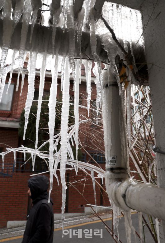 [이데일리 노진환 기자] 연일 한파가 이어지고 있는 23일 오후 서울 강남구 언주로의 한 주택가에 배수관이 동파돼 고드름이 얼어붙어 있다.