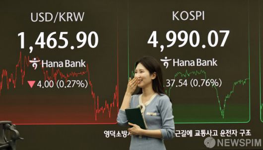 [서울=뉴스핌] 양윤모 기자 = 23일 오후 코스피가 전장 종가보다 37.54 포인트(0.76%) 상승하며 4990.07로, 코스닥은 23.59 포인트(2.43%) 상승한 993.94로 장을 마감한 가운데, 서울 중구 하나은행본점 딜링룸에서 직원들이 업무를 보고 있다. 서울외환시장에서 달러/원 환율은 전장 대비 4.00원 하락한 1465.90원에 주간거래를 마감했다. 2026.01.23 yym58@newspim.com