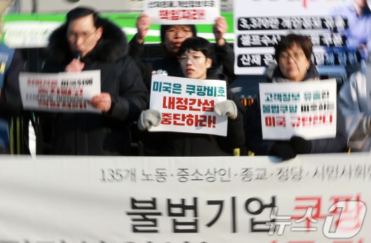 (서울=뉴스1) 이호윤 기자 = 민주노총과 안전한 쿠팡만들기 공동행동, 온라인플랫폼법제정연대 등 시민단체들이 23일 서울 종로구 주한 미국대사관 건너편에서 열린 '미국 정·재계 규탄 긴급기자회견'에서 규탄 발언을 하고 있다. 2026.1.23/뉴스1256@news1.krCopyright ⓒ 뉴스1. All rights reserved. 무단 전재 및 재배포, AI학습 이용 금지.