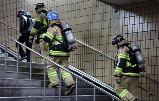23일 오후 서울지하철 1호선 종로3가역에서 소방관이 철수하고 있다. 이날 오후 2시 41분경 1호선 상행선 열차 하부에서 연기가 발생해 한때 승객들이 외부로 대피하고 상행선 열차가 무정차 통과했다. 현재 1호선 열차는 정상운행중이다. 뉴스1 |
