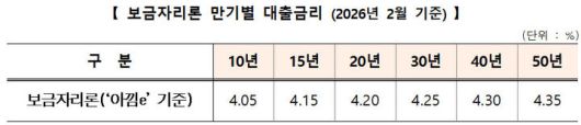 이에 따라 '아낌e-보금자리론' 기준으로 만기 10년은 연 4.05%, 만기 50년은 4.35%가 적용된다.