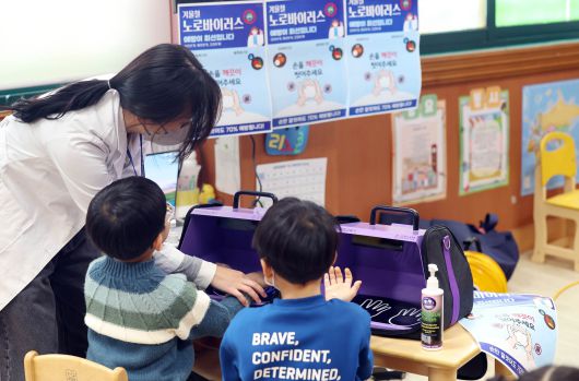 19일 오전 광주 북구청직장어린이집에서 열린 겨울철 노로바이러스 예방 교실에서 북구보건소 직원들이 올바른 손 씻기 수칙을 알려주고 있다. /연합뉴스 |