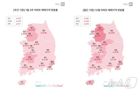 한편, 1월 셋째 주 전국 아파트 매맷값은 전주 대비 0.32% 상승했다. 같은 기간 서울이 0.41% 올랐고 수도권과 경기·인천이 각각 0.36%, 0.30% 상승했다.