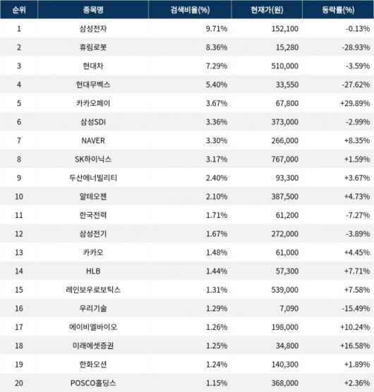 이어 검색비율 2위의 휴림로봇(090710)은 등락률 -28.93%로 하락 마감했다. 검색비율 3위의 현대차(005380)는 -3.59% 하락했다. 검색비율 4위 현대무벡스(319400)는 하락률 27.62%의 큰 낙폭으로 하락했다. 검색비율 5위 카카오페이(377300)는 29.89% 상승하며 상한가로 마감했다.