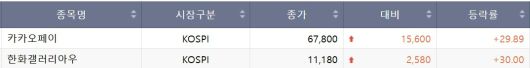 23일 코스피 시장에서 상한가를 기록한 종목은 카카오페이, 한화갤러리아우다.