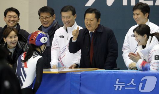 (진천=뉴스1) 김용빈 기자 = 정청래 더불어민주당 대표가 23일 충북 진천국가대표선수촌 빙상장에서 쇼트트랙 국가대표 선수들을 응원하고 있다. 2026.1.23./뉴스1vin06@news1.krCopyright ⓒ 뉴스1. All rights reserved. 무단 전재 및 재배포, AI학습 이용 금지.