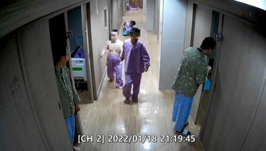 2022년 1월18일 밤 9시19분 울산시 울주군 반구대병원 폐쇄병동에서 지적 장애인 김도진(가명, 32)씨가 한 환자의 손에 이끌려 방으로 들어가고 있다. 오른쪽은 김씨 살해를 주도한 주범이고, 왼쪽은 종범이다. 피해자 김씨가 옷을 벗은 채 탈출을 시도하다가 이들에 의해 방안으로 밀려들어 간 시각은 25분 뒤인 9시44분이었다. CCTV 갈무리 |