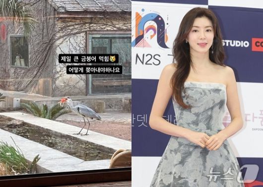 사진 속에는 박한별의 제주 카페에 왜가리가 날아 들어와 카페 연못에 살고 있는 금붕어를 입에 물고 있는 모습이 담겼다.