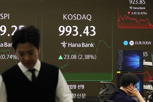 코스닥이 2% 넘게 상승하며 강세를 보인 23일 서울 중구 하나은행 딜링룸에 종가가 표시돼 있다. 이날 코스닥은 993.43으로 장을 마감했다. 정효진 기자 |