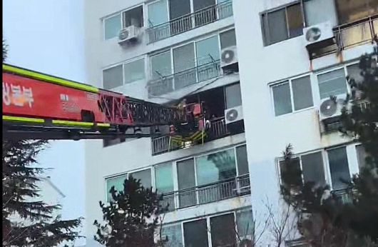 광양소방서가 지난 19일 금호동 아파트에서 화재가 발생하자 사다리차를 동원해 인명을 구조하고 있다. 광양소방서 제공. |