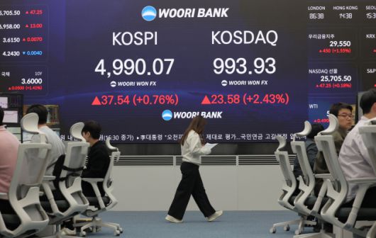 23일 한국거래소에 따르면 이날 코스피지수는 전 거래일 대비 37.54포인트(0.76%) 오른 4990.07포인트에, 코스닥지수는 23.58포인트(2.43%) 오른 993.93포인트에 거래를 마쳤다. 코스피지수는 이날에도 사상 최고치를 경신하면서 종가 기준 5000포인트 마감을 눈 앞에 뒀다. 코스닥지수는 장중 998.32포인트까지 치솟으면서 52주 최고치를 새로 썼다.