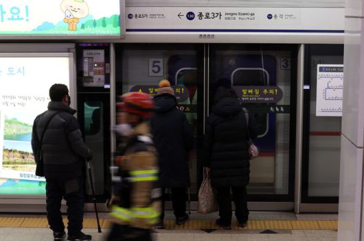 23일 서울 지하철 1호선 종로3가역 상행선 열차의 차량 하부에서 연기가 발생해 승객들이 전원 하차, 대피했다. 소방당국에 따르면 연기는 브레이크 과열로 인한 것으로 추정된다. 이날 연기 발생 뒤 이용객들의 승강장 출입을 통제 중인 경찰. 연합뉴스 |