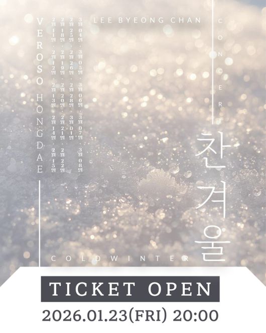 ‘찬겨울’은 2월 11일부터 3월 8일까지 약 4주간 19회로 진행된다. 이번 공연은 ‘겨울’ 테마로, 추운 겨울에서 봄으로 이어지는 계절의 흐름을 이병찬 특유의 따뜻한 감성으로 풀어낼 예정이다. 특히 오직 콘서트에서만 볼 수 있는 무대는 물론, 팬들과 가까이서 호흡할 수 있는 특별한 코너까지 팬들과 잊지 못할 시간을 완성할 것으로 기대된다.