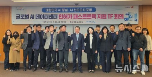 [포항=뉴시스] 송종욱 기자 = 포항시는 23일 시청 소회의실에서 남구 오천읍 광명산단에 조성 중인 '글로벌 AI 데이터 센터’의 인허가 상황을 점검하고, 신속한 사업 추진을 위해 패스트 트랙 TF 회의를 열었다. 사진은 패스트 트랙 TF 회의 이후 기념 촬영 모습. (사진=포항시 제공) 2026.01.23. photo@newsis.com |