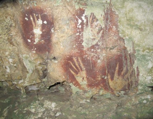 인도네시아 술라웨시 무나섬 동굴에서 발견된 6만7천800년 전에 제작된 음각 손자국 그림. 사진=호주 그리피스대학교 |