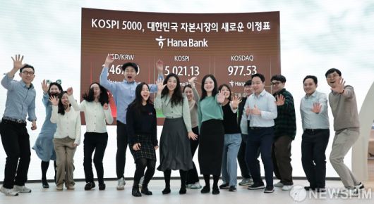 [서울=뉴스핌] 양윤모 기자 = 1980년 코스피 시장이 열린지 46년 만에 사상 처음으로 5021.13을 돌파하자  23일 서울 중구 하나은행본점 딜링룸에서 직원들이 축하 기념촬영을 하고 있다.  2026.01.23 yym58@newspim.com