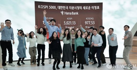 [서울=뉴스핌] 양윤모 기자 = 1980년 코스피 시장이 열린지 46년 만에 사상 처음으로 5021.13을 돌파하자 23일 서울 중구 하나은행본점 딜링룸에서 직원들이 축하 기념촬영을 하고 있다. 2026.01.23 yym58@newspim.com