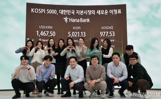 [서울=뉴스핌] 양윤모 기자 = 1980년 코스피 시장이 열린지 46년 만에 사상 처음으로 5021.13을 돌파하자 23일 서울 중구 하나은행본점 딜링룸에서 직원들이 축하 기념촬영을 하고 있다. 2026.01.23 yym58@newspim.com