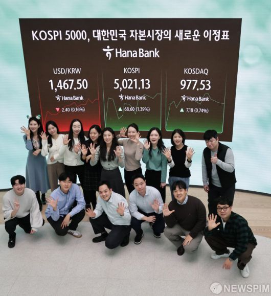 [서울=뉴스핌] 양윤모 기자 = 1980년 코스피 시장이 열린지 46년 만에 사상 처음으로 5021.13을 돌파하자 23일 서울 중구 하나은행본점 딜링룸에서 직원들이 축하 기념촬영을 하고 있다. 2026.01.23 yym58@newspim.com