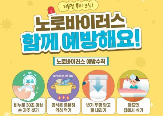 질병청은 노로바이러스 감염을 예방하기 위해 위생 수칙 준수를 당부했다. 손 소독제보다 비누를 이용해 30초 이상 손을 씻고 식재료를 흐르는 물에 세척해 85℃ 이상에서 1분 이상 충분히 익히는 등 안전하고 위생적으로 조리된 음식을 섭취해야 한다.